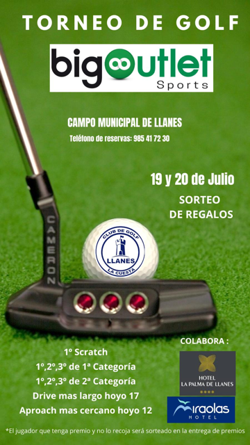 Estimado socio, le recordamos que los próximos días 19 y 20 de julio (viernes o sabado, con opción de jugar uno de los dos días), se celebrará en el campo de golf municipal de Llanes el TORNEO CLUB DE GOLF LA CUESTA - BIG OUTLET - HOTEL LA PALMA DE LLANES.